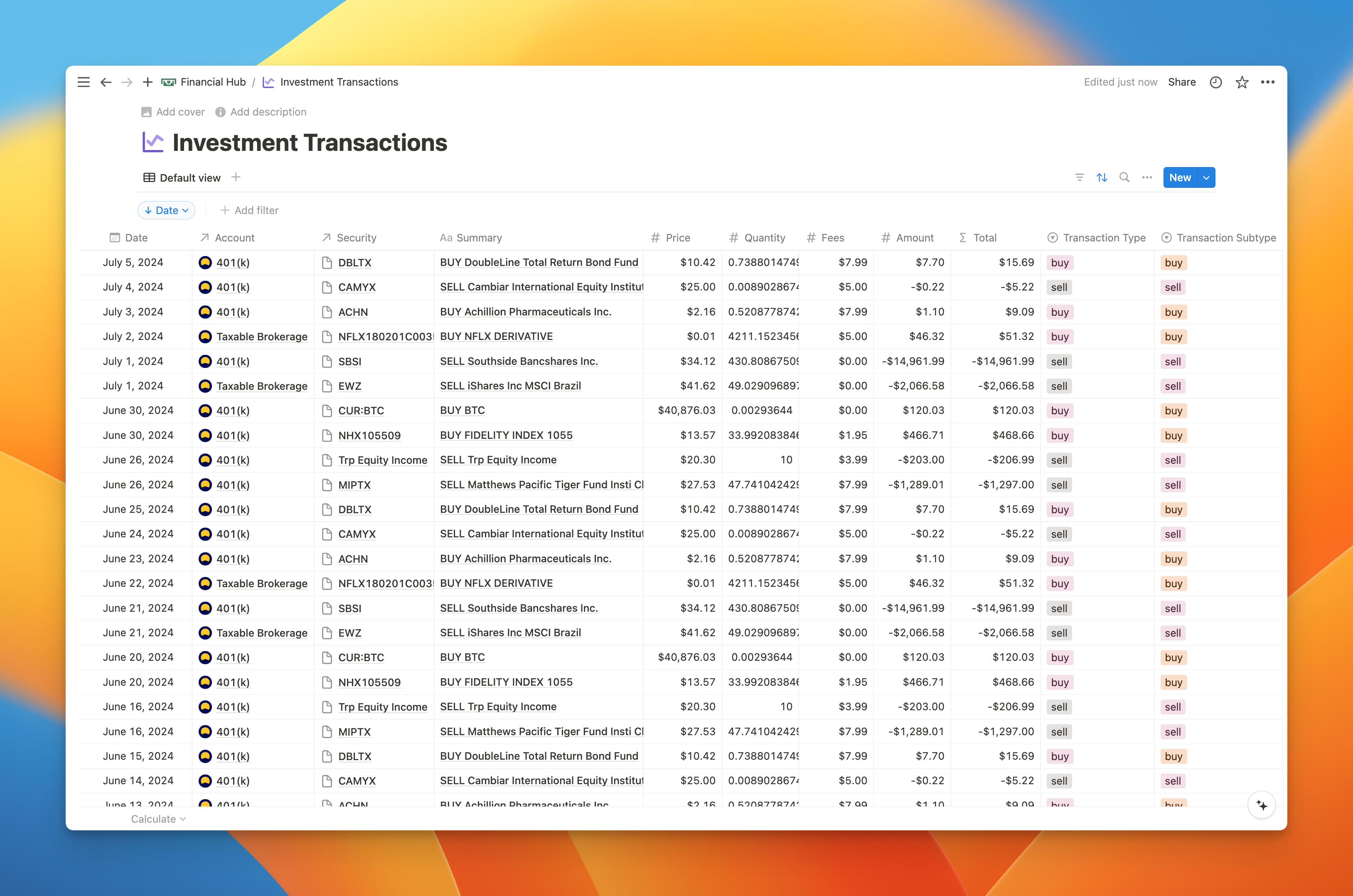 You can also see your investment transactions such as buys, sells, and dividend payments in the investment transactions table.